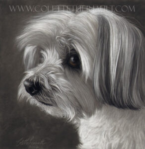 A portrait can also be created from several “not as good” poses or shots. If at all possible, I do need at least one good photograph showing the eyes. However, do not despair if you don’t have any great pictures. I can usually work with what you have along with verbal descriptions of your pet. Much of my work involves beloved pets that have passed and one of the reasons the client wants a portrait is because they don’t have any good photos. Tangible photographs will be returned once the artwork is completed.